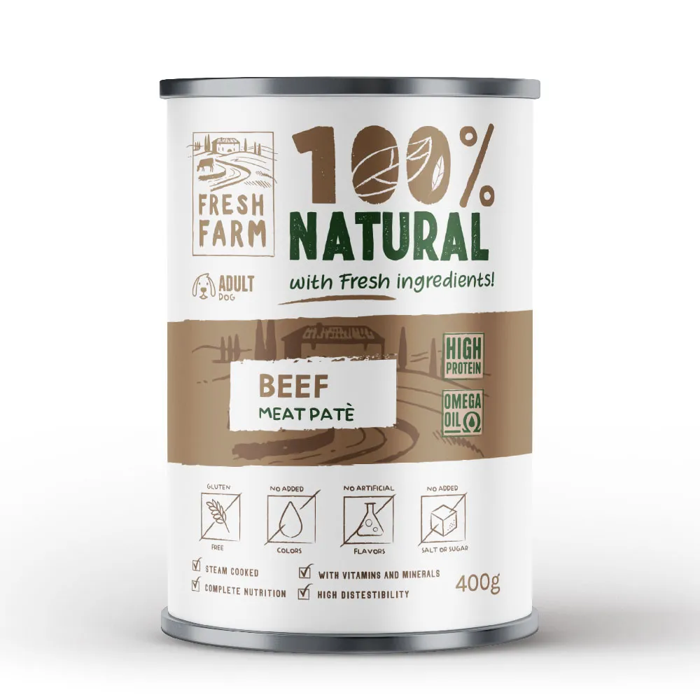 Fresh Farm 100% Natural απαλό πατέ με βοδινό , πλήρης υγρή τροφή για ενήλικους σκύλους. σε μορφή απαλού πατέ.
